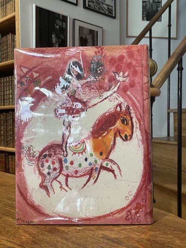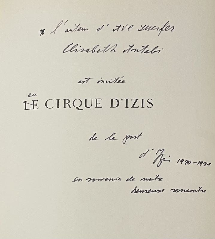 in-4, toile éditeur rouge, jaquette illustrée et rhodoïd imprimé, 171 pp. Superbe recueil consacré au cirque. Édition originale du texte de Prévert et premier tirage des 76 photographies en noir et blanc d'Izis imprimées en héliogravure. L'ouvrage comprend également 4 compositions originales de Marc Chagall reproduites en couleurs (un frontispice, une sur double page et 2 à pleine page répétées sur la jaquette). Bon exemplaire avec un envoi autographe signé du photographe à l'écrivaine Élisabeth Antébi.
