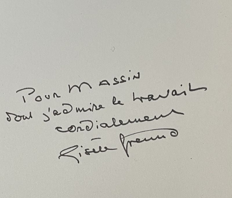 in-8, broché, non paginé (52 pp.), 4 portraits en couleurs et 15 en héliogravure. Cet excellent catalogue d'exposition, décrivant 200 portraits d'écrivains et d'artistes, a été entièrement rédigé par Gisèle Freund qui revient sur les conditions dans lesquelles elle a pu prendre ces photos, avec l'aide notamment d'Adrienne Monnier souvent évoquée au cours de ces pages. Bel envoi autographe signé de la photographe au graphiste Massin "dont j'admire le travail". En bonne condition.