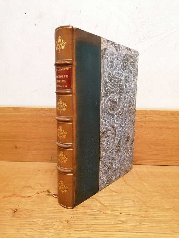 petit in-8, demi-chagrin gris bleu, dos à nerfs orné de fleurons dorés, pièce de titre bordeaux, tête dorée, couvertures et dos conservés (rel. Jean Raymond), 300 pp. Edition originale enrichie d'une carte autographe signée de l'auteur et d'une carte de visite autographe du chanoine Fichaux. Dos passé, sinon très bon exemplaire dans une reliure signée de l'époque.