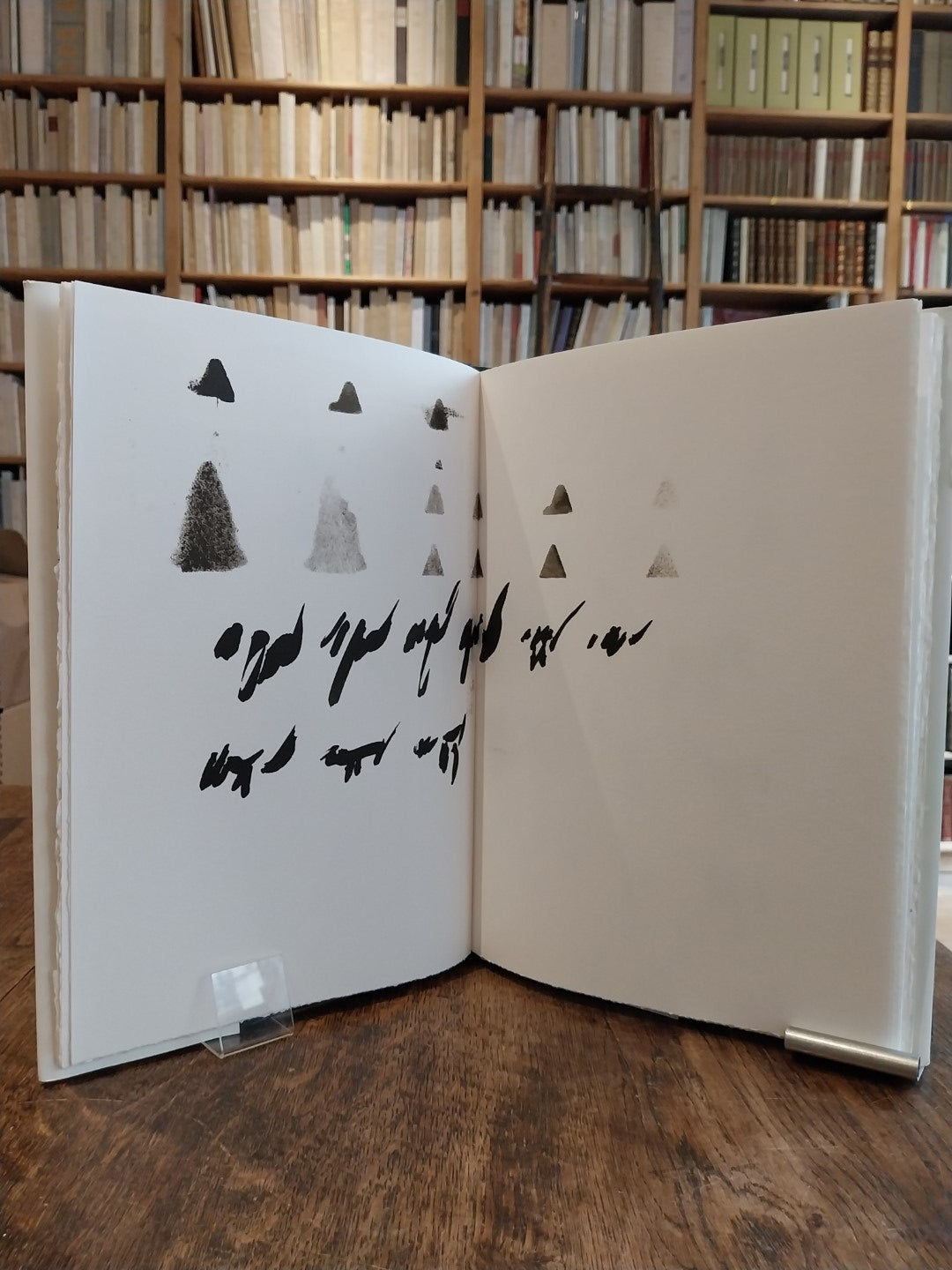in-4, cartonnage éditeur noir, jaquette, non paginé (64 p.). Premier tirage de cette série de 8 double pages de dessins automatiques sur vélin Johannot blanc 125 g., suivie de 16 pages de texte sur vélin d'Arches 250 g. Tirage limité à 150 exemplaires signés par Maurice Benhamou. Bien complet du fac similé de dessin d'enfant, point de départ de ce livre d'artiste. Infime déchirure sans manque à la jaquette.