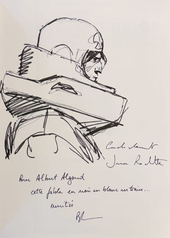 in-4, broché, couverture illustrée, 70 pp. illustrées en noir et blanc. Edition originale. Envoi autographe signé de Benjamin Legrand à Albert Algoud, avec un grand dessin original signé de Jean-Marc Rochette. Très bon état.
