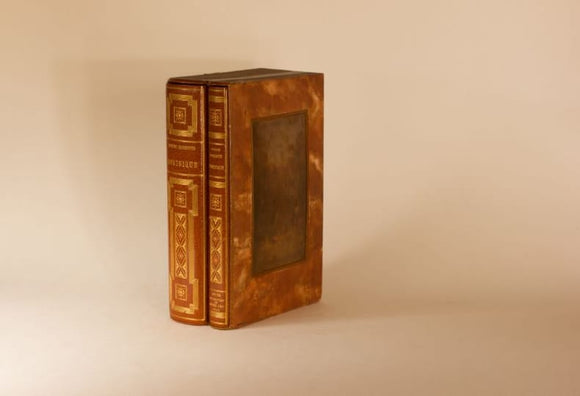 in-4, demi-maroquin à gros grain à coins fauve bordé d'un double filet doré, dos lisse orné d'un décor en long composé de filets dorés et de fleurons mosaïqués rouge, tête dorée, couverture illustrée et dos conservés (Semet & Plumelle), 355 pp., frontispice. Édition illustrée de 74 pointes sèches originales de Michel Ciry, peintre prometteur alors âgé de 23 ans et tout juste admis à la Société des peintres graveurs français. Tirage limité à 225 numérotés sur vélin pur chiffon dArches, celui-ci un des 36 premiers (n° 9) contenant une suite des pointe sèches, dont un certain nombre avec remarques supplémentaires, et deux des cuivres originaux. La suite a été reliée à part et à l'uniforme, le tout présenté sous un étui bordé de papier marbré fauve à double compartiment portant, incisés sur les plats, les deux cuivres. Belle réalisation.