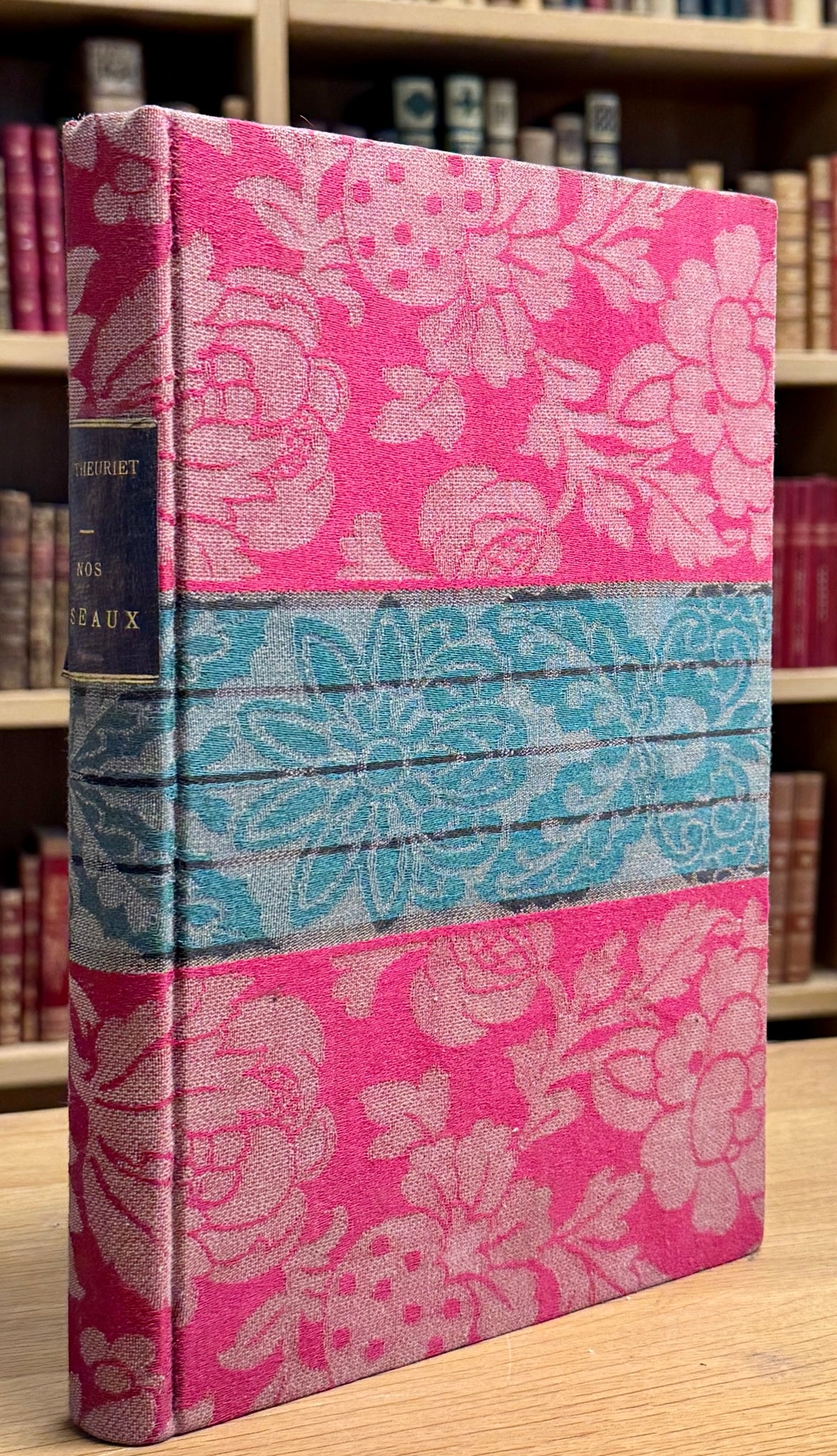 in-4, bradel cartonnage de tissu, pièce de titre de basane noire, couvertures conservées, XVI + 200 pp., nombreuses illustrations, fleurons, encadrements et ornementations par H. Giacomelli gravés sur bois par J. Huyot (dont 20 hors-texte). Bon exemplaire, revêtu d'un élégant cartonnage de soie brochée aux motifs floraux.