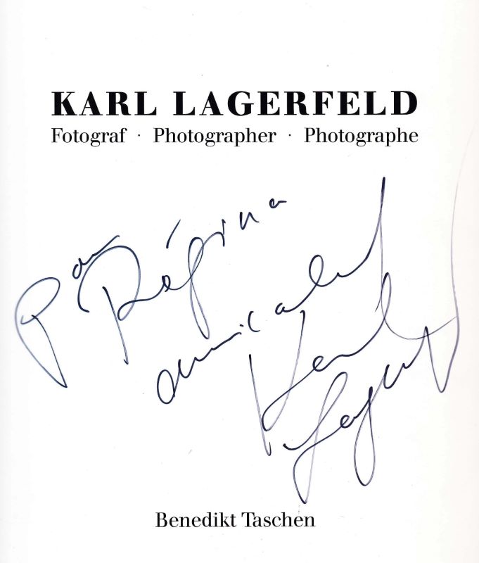 in-4, cartonnage noir de l'éditeur, non paginé, 158 pp. Album d'une centaine de photographies de mode et portraits, en noir et en couleurs, avec un texte du célèbre couturier qui évoque son rapport à la photo depuis l'enfance (en versions allemande, anglaise et française). Bon exemplaire enrichi d'un envoi autographe signé de Lagerfeld à Régine. En bonne condition.