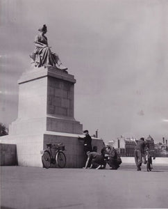 Des passants s'abritent derrière l'une des statues du pont du Carrousel. Photographie originale en tirage d'époque.