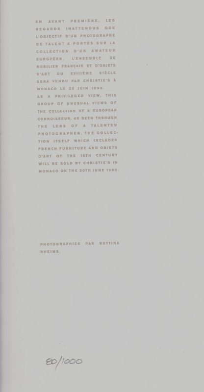 in-4, cartonnage toilé brun, jaquette, 26 pp. Premier tirage des nombreuses photographies par Bettina Rheims sur cet album dévoilant quelques pièces de la collection d'un amateur de mobilier français et d'objets d'art du XVIIIe siècle (vente du 20 juin 1992). Tirage limité à 1000 exemplaire (n°80). En bonne condition.