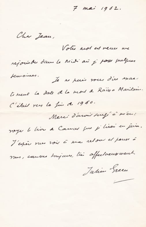 GREEN (Julien). | Correspondance amicale à l'éditeur Jean Denoël (sept lettres autographes signées).