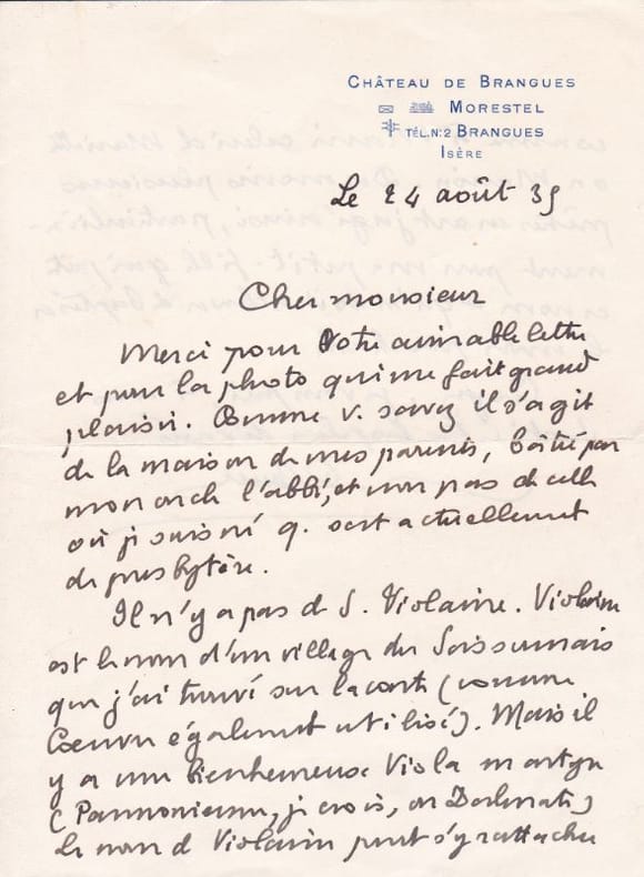 1 page et demi in-8, à l'en-tête imprimé du "Château de Brangues" (Isère), datée "le 24 août 35", enveloppe conservée. Dans cette belle lettre inédite, Claudel commence par remercier son correspond, industriel et poète rémois (1902-1979), de l'envoi d'une photo qui lui a fait grand plaisir... "comme vous savez il s'agit de la maison de mes parents, bâtie par mon oncle l'abbé, et non pas de celle où je suis né qui sert actuellement de presbytère". Puis il s'explique sur l'origine du prénom Violaine : "Il n'y a pas de S. Violaine. Violaine est le nom d'un village du Soissonnais que j'ai trouvé sur la carte (comme Coeuvre également utilisé). Mais il y a un bienheureux Viola martyr (Pannonien, je crois, en Dalmatie). Le nom de Violaine peut s'y rattacher comme à Marie celui de Mariette ou Marion. Du moins plusieurs prêtres en ont jugé ainsi, particulièrement pour ma petite-fille qui porte ce nom et qu'on doit achever de baptiser le mois prochain".