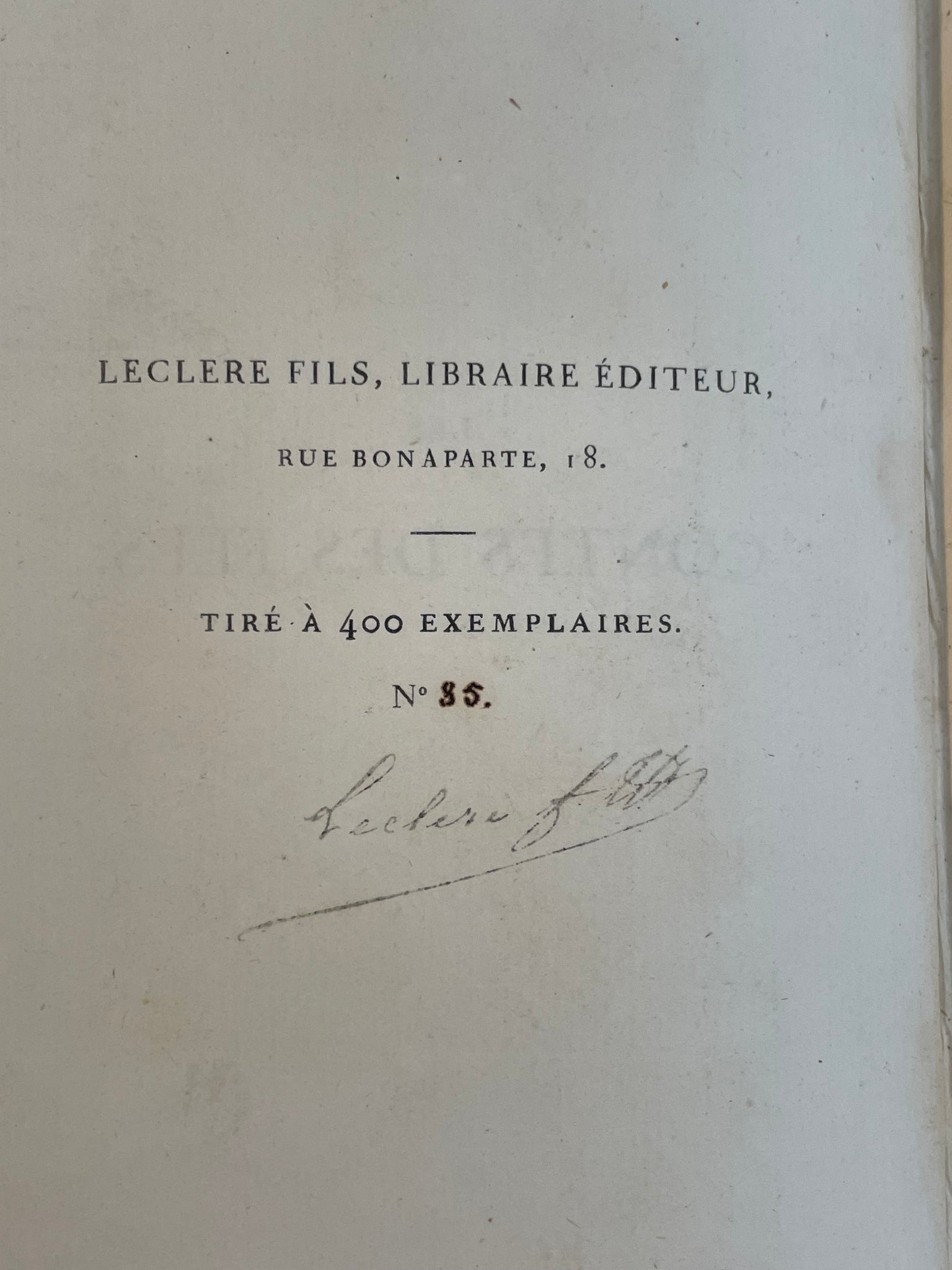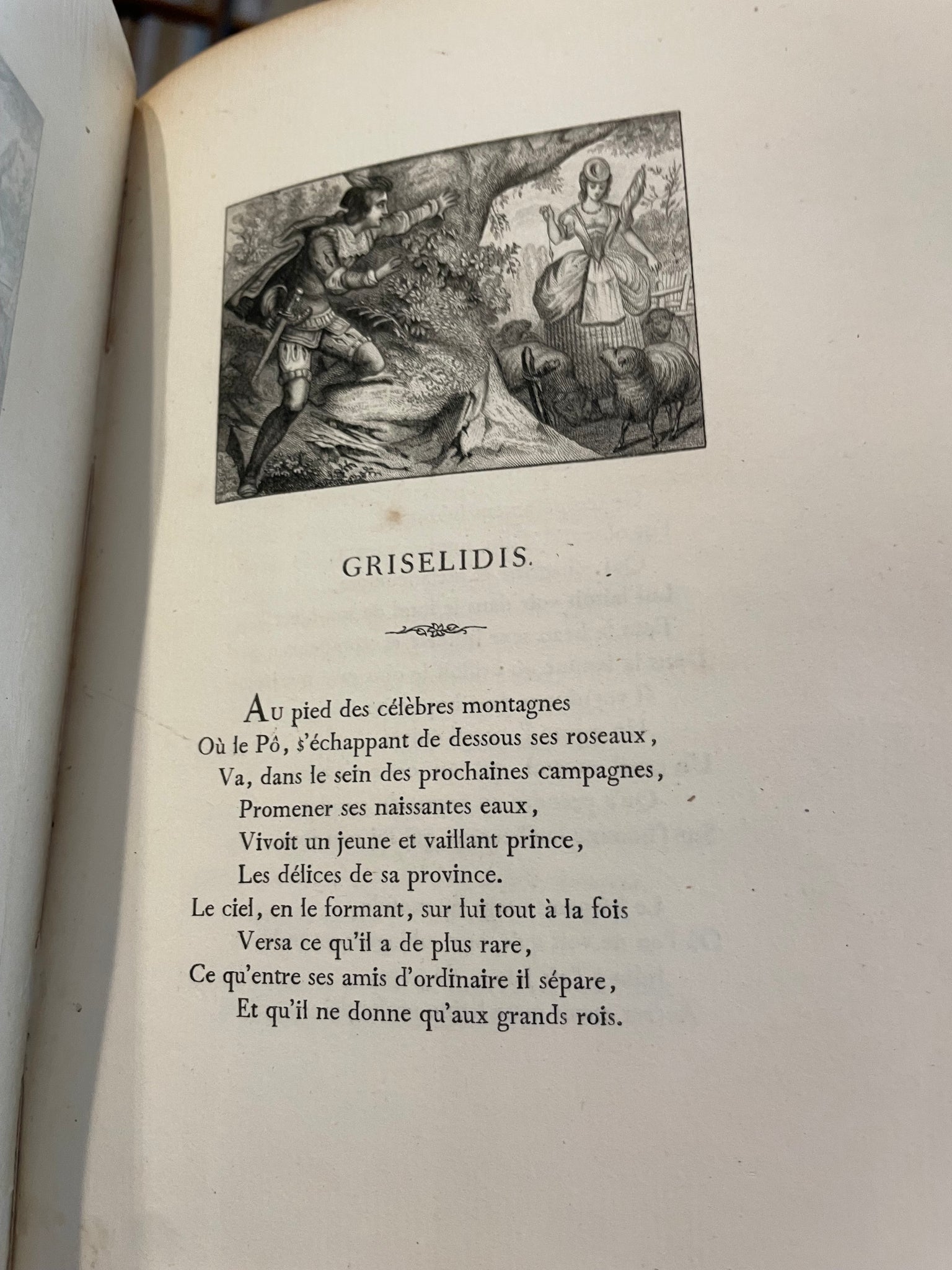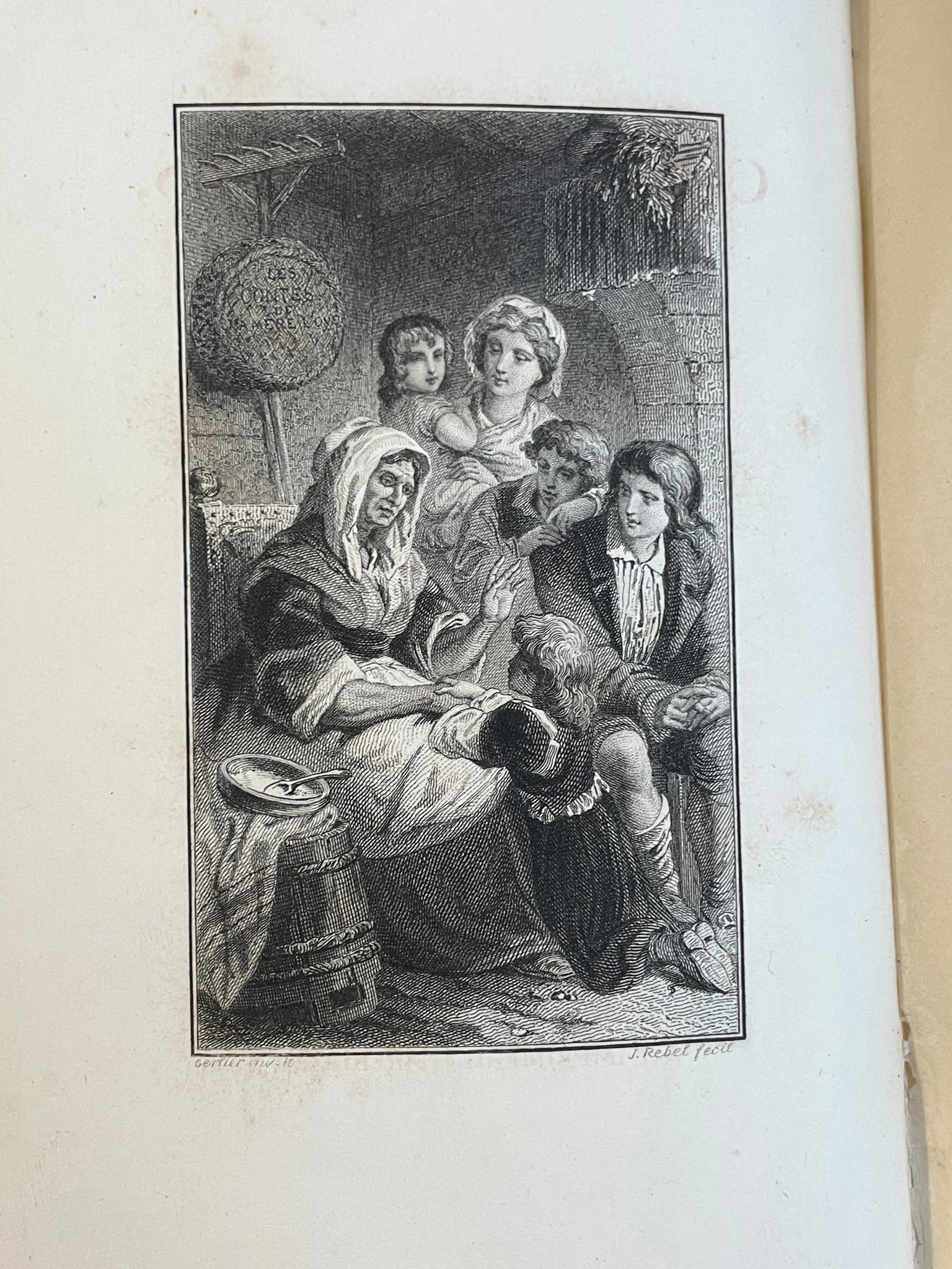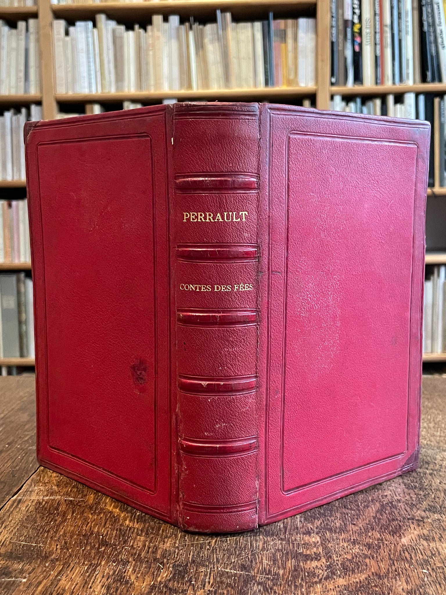 in-8, plein chagrin rouge, dos à nerfs plats, filets à froid au dos et en encadrement sur les plats, LXXIII + 290 pp. Première édition critique donnée par Ch. Giraud illustrée d'un frontispice par Gerlier, d'un portrait de l'auteur par Annedouche et de 14 vignettes gravées en tête de chaque conte. Tirage limité à 400 exemplaires sur vergé numérotés et signés par l'éditeur, enrichi d'un double état sur Chine de la plupart des gravures. Habile restauration à deux coins de la reliure, quelques légères rousseurs, sinon bon exemplaire en reliure d'époque.