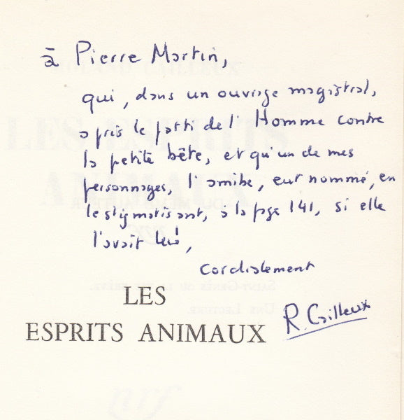 in-12, broché, 238 pp. Édition originale de cet étonnant bestiaire mêlant animaux et chimères avec un parti pris d'écriture qui évoque Ponge et Michaux. Par un écrivain rare et exigeant qui fut aussi gastro-entérologue... Un des 25 exemplaires numérotés sur vélin pur fil Lafuma-Navarre, seul tirage en grand papier, avec un bel envoi autographe signé de l'auteur à un zoologiste. En parfait état.