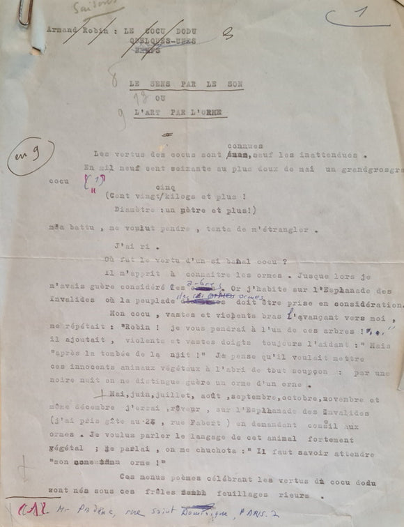 Tapuscrit signé "Le Sens par le son ou l'art par l'orme".