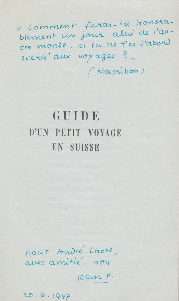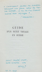 in-16, broché, non coupé, 79 pp. Édition originale. Un des 10 exemplaires numérotés sur bleuté Guérimand réservés à l'auteur, celui-ci enrichi d'un envoi autographe signé à André Lhote, avec une citation fantaisiste : "comment feras-tu honorablement un jour celui de l'autre monde, si tu ne t'es pas d'abord exercé aux voyages? (Massillon)". On joint : CALET (Henri). Rêver à la suisse. Avertissement de Jean Paulhan. Paris, Éditions de Flore, coll. "Propos", 1948, in-16, couverture rempliée, 104 pp. Édition originale. Un des 210 exemplaires numérotés sur Crève-coeur crème du Marais, seul tirage en grand papier.Ces deux exemplaires, en parfait état, sont réunis sous un double emboîtage de papier vert avec dos chagrin vert sapin portant les noms des deux auteurs et le titre "La Suisse" (A. Devauchelle).