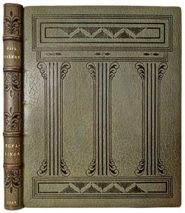 in-4, plein maroquin à gros grain vert céladon, dos à quatre nerfs orné d'un décor en long de filets à froid, plats ornés d'un décor en colonnade composé de filets à froid, fine bordure intérieure de même maroquin vert, doublures de maroquin beige, gardes de tissu vert à motifs serpentant or, doubles gardes, tranches dorées sur témoins, couvertures et dos conservés (M. Rainsford), 121 pp. Premier tirage des 15 compositions de Camille Beltrand gravées sur bois en couleurs. Un des 30 exemplaires numérotés sur Japon contenant une suite sur Chine des compositions signées par l'artiste. Exemplaire enrichi d'une aquarelle contrecollée sur papier fort. Superbe reliure signée de l'époque, en très belle condition [Karaïskakis & Chapon, 25C].